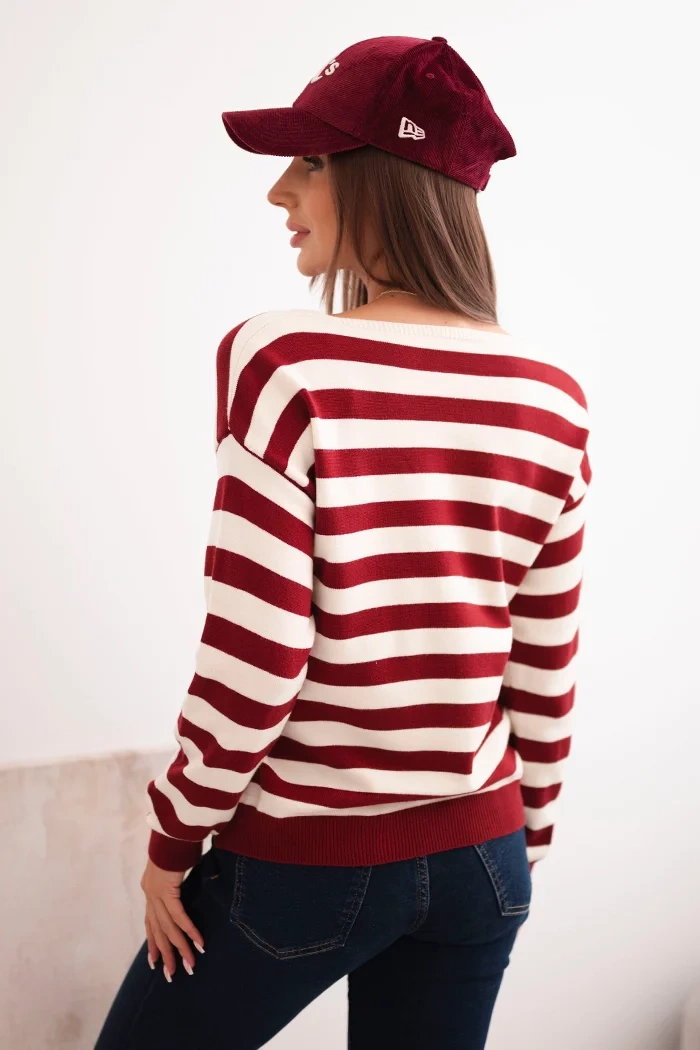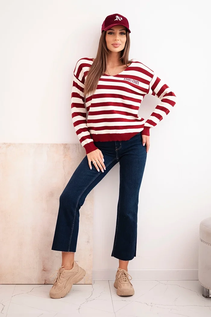 Sweter damski w paski z dekoltem V bordowy to połączenie ponadczasowego stylu i codziennej wygody. Wykonany z miękkiej i elastycznej dzianiny, zapewnia przyjemne uczucie na skórze i komfort noszenia przez cały dzień. Poziome paski dodają mu modowego charakteru, a napis „min min” subtelnie wyróżnia go spośród klasycznych fasonów.