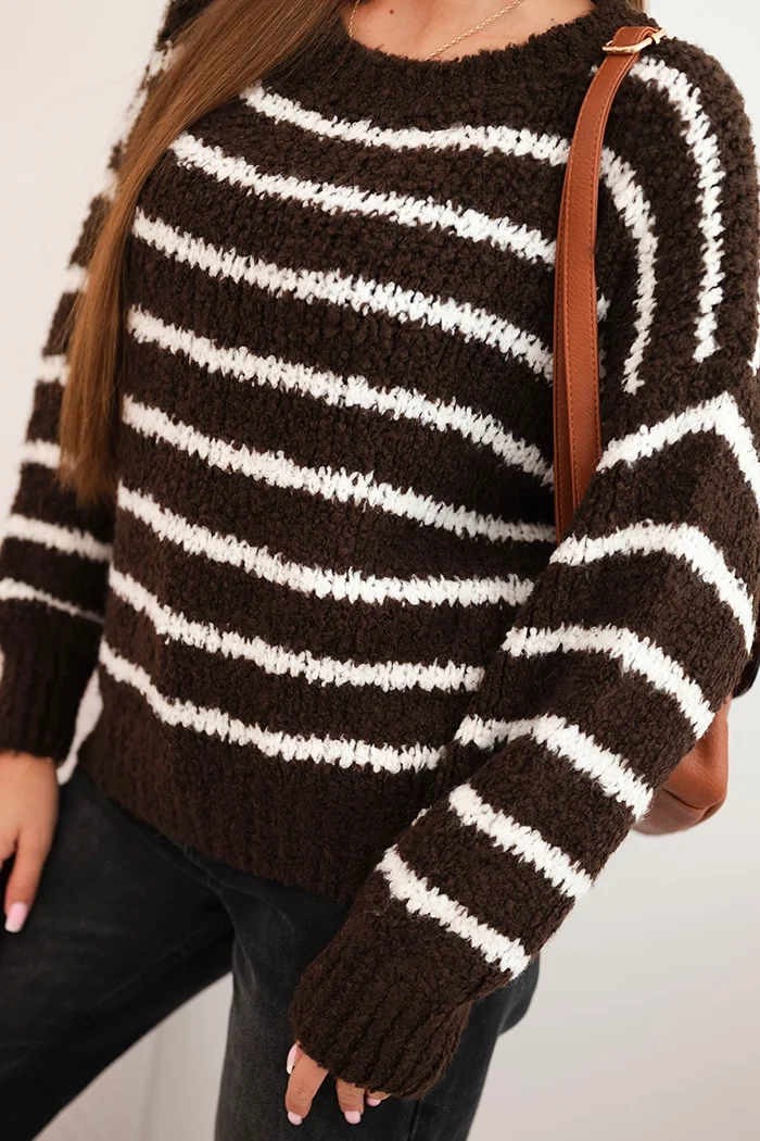 Ten sweter damski w paski to idealny wybór na chłodniejsze dni! Wykonany z przyjemnej w dotyku, miękkiej dzianiny, zapewnia nie tylko ciepło, ale również wyjątkowy komfort noszenia. Luźny fason z delikatnie obniżoną linią ramion świetnie układa się na sylwetce, nadając stylizacji swobodny, modny charakter. Klasyczny wzór w poziome paski sprawia, że sweter pasuje zarówno do jeansów, jak i eleganckich spodni czy spódnic.