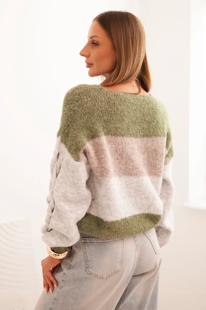 Sweter damski w pasy z warkoczami na rękawach z wełny khaki + szary to ciepła i stylowa propozycja na chłodniejsze dni. Miękki materiał otula ciało, zapewniając wysoki komfort noszenia, a luźny krój gwarantuje swobodę ruchów. Dekolt w serek pięknie podkreśla szyję, natomiast ozdobne warkocze na rękawach dodają całości niepowtarzalnego uroku.