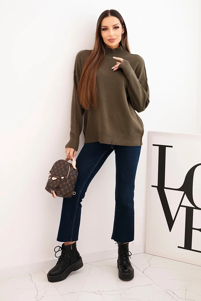 Model posiada półgolf, który delikatnie otula szyję i dodaje całości elegancji. Rozcięcia po bokach nadają lekkości i sprawiają, że sweter dobrze współgra zarówno z jeansami, legginsami, jak i spódnicą.