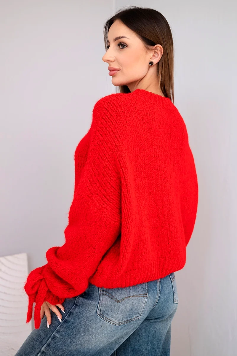 Sweter damski z dodatkiem moheru z grubym splotem i ozdobnymi rękawami czerwony Ten sweter damski z grubym splotem to idealny wybór na chłodniejsze dni. Wyróżnia się stylowym, oversize’owym krojem oraz uroczymi detalami przy rękawach w formie supłów, które dodają mu charakteru. Dzięki swojej miękkiej i puszystej fakturze zapewnia nie tylko modny wygląd, ale także komfort noszenia na co dzień.
