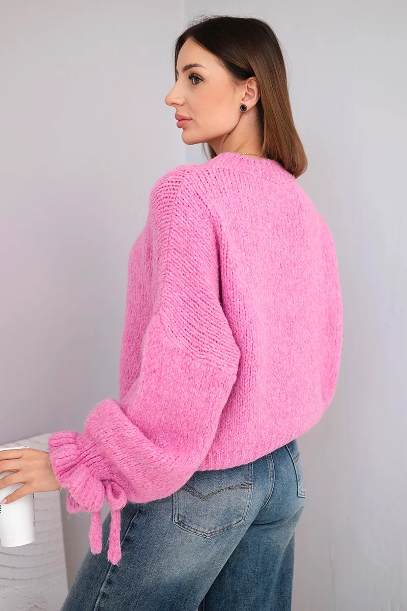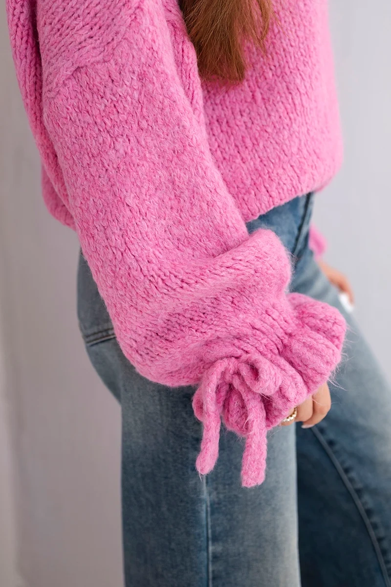 Sweter damski z dodatkiem moheru z grubym splotem i ozdobnymi rękawami różowy Ten sweter damski z grubym splotem to idealny wybór na chłodniejsze dni. Wyróżnia się stylowym, oversize’owym krojem oraz uroczymi detalami przy rękawach w formie supłów, które dodają mu charakteru. Dzięki swojej miękkiej i puszystej fakturze zapewnia nie tylko modny wygląd, ale także komfort noszenia na co dzień.