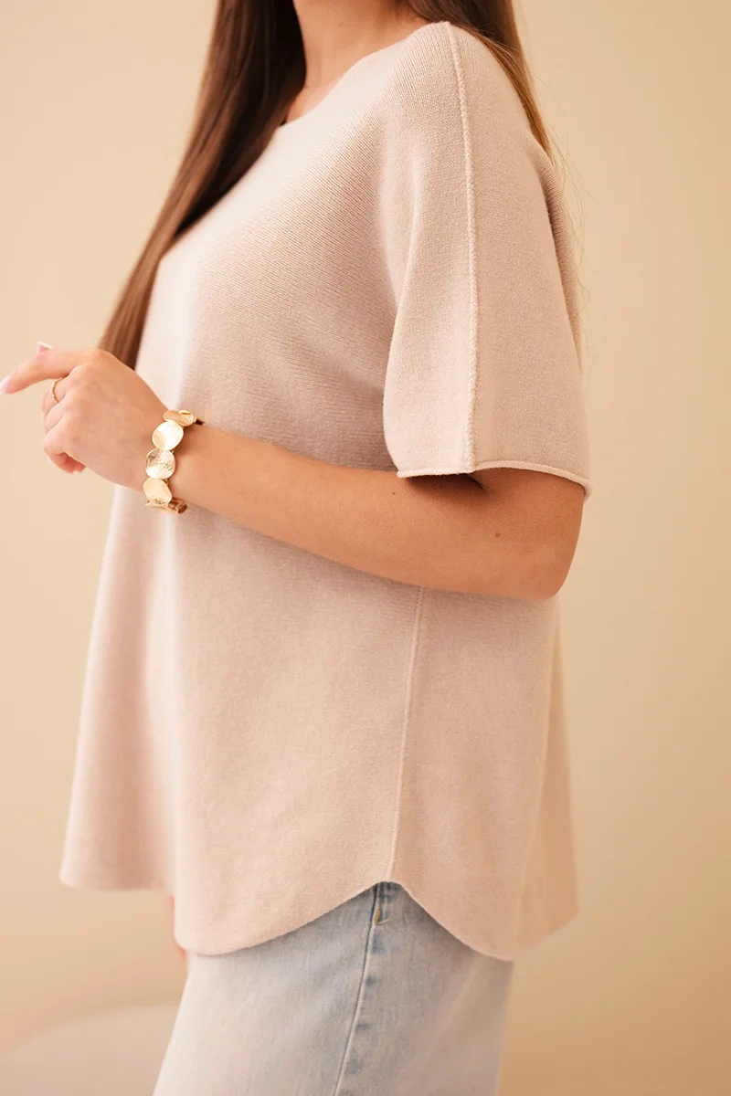 Sweter damski z krótkim rękawem o luźnym kroju beżowy to idealna propozycja dla kobiet ceniących sobie komfort i styl w codziennym wydaniu. Wykonana z wysokiej jakości mieszanki wiskozy, poliestru i nylonu, świetnie dopasowuje się do sylwetki, jednocześnie pozostając przewiewna i przyjemna w dotyku.