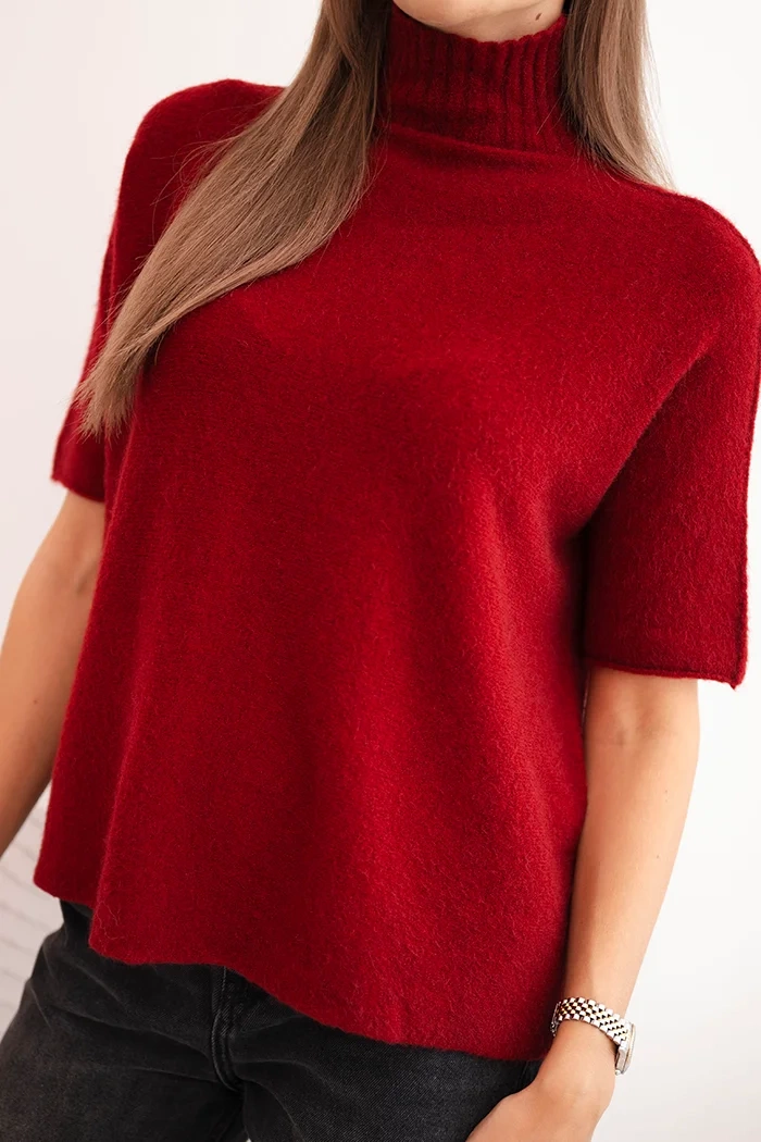 Sweter damski z krótkim rękawem o luźnym kroju bordowy Szukasz idealnego połączenia wygody i stylu? Ten sweter damski z krótkim rękawem to świetna propozycja na chłodniejsze dni i przejściowe pory roku. Luźny fason zapewnia swobodę ruchów i komfort noszenia, a miękki, przyjemny w dotyku materiał sprawia, że nie będziesz chciała go zdjąć.