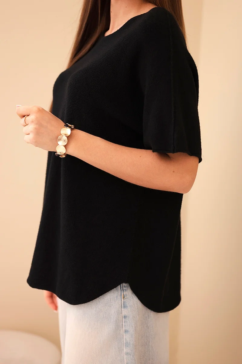 Sweter damski z krótkim rękawem o luźnym kroju czarny to idealna propozycja dla kobiet ceniących sobie komfort i styl w codziennym wydaniu. Wykonana z wysokiej jakości mieszanki wiskozy, poliestru i nylonu, świetnie dopasowuje się do sylwetki, jednocześnie pozostając przewiewna i przyjemna w dotyku.