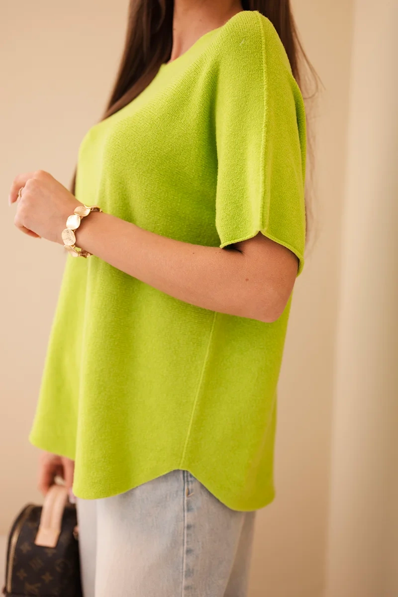 Sweter damski z krótkim rękawem o luźnym kroju pistacjowy to idealna propozycja dla kobiet ceniących sobie komfort i styl w codziennym wydaniu. Wykonana z wysokiej jakości mieszanki wiskozy, poliestru i nylonu, świetnie dopasowuje się do sylwetki, jednocześnie pozostając przewiewna i przyjemna w dotyku.