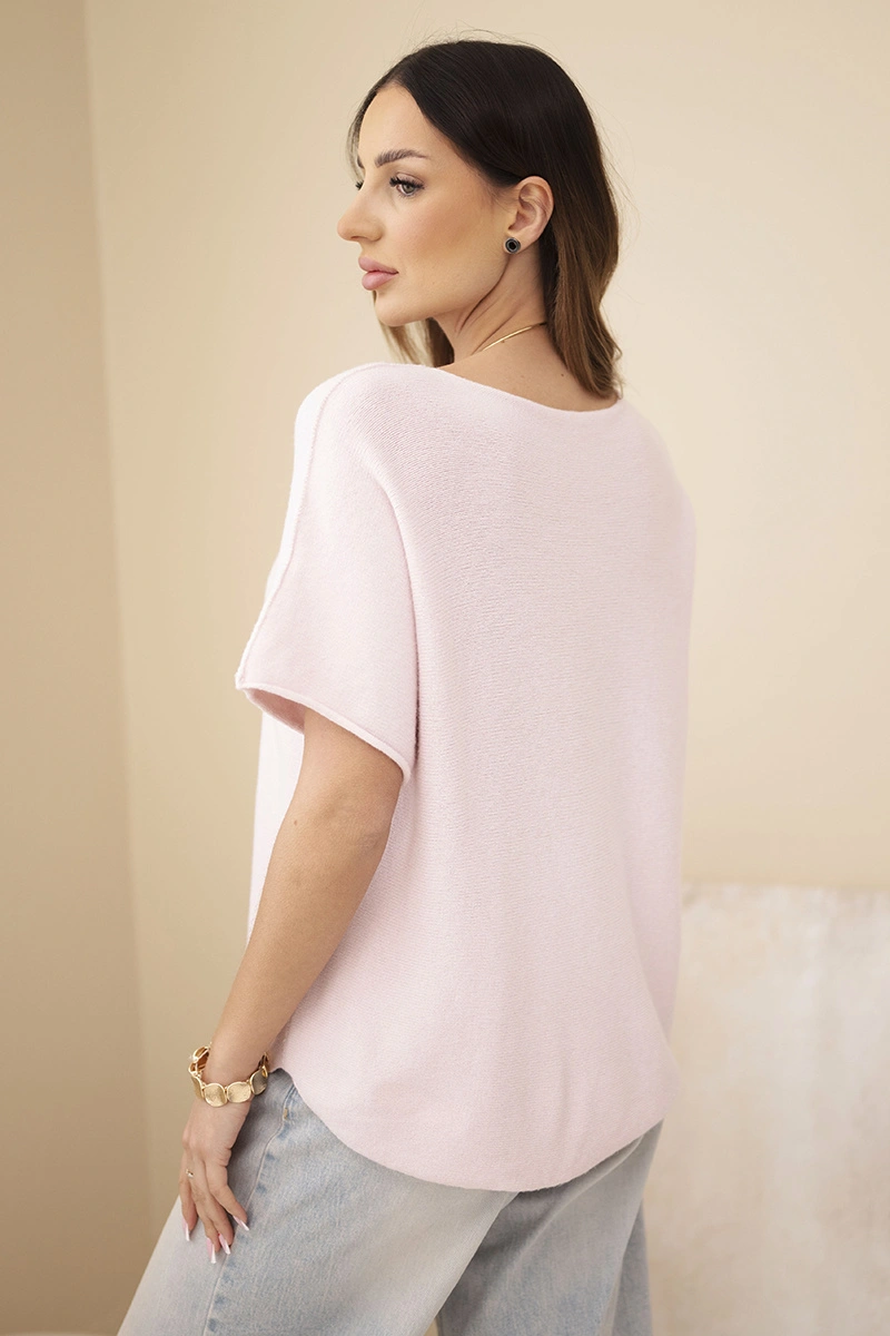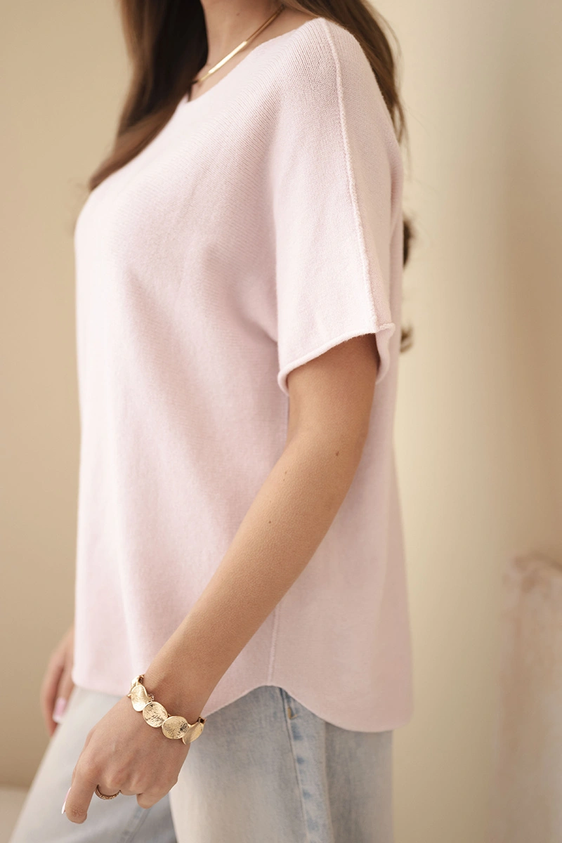 Sweter damski z krótkim rękawem o luźnym kroju pudrowy róż Ten damski z krótkim rękawem to idealna propozycja dla kobiet ceniących sobie komfort i styl w codziennym wydaniu. Wykonana z wysokiej jakości mieszanki wiskozy, poliestru i nylonu, świetnie dopasowuje się do sylwetki, jednocześnie pozostając przewiewna i przyjemna w dotyku.