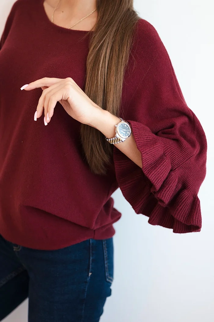 Sweter damski z ozdobnym mankietem bordowy Stylowy sweter damski z szerokim rękawem zakończonym efektownym mankietem to doskonały wybór na chłodniejsze dni. Wykonany z miękkiej, przyjemnej w dotyku dzianiny, łączy w sobie komfort noszenia z modnym wyglądem. Luźny krój oraz opadająca linia ramion nadają sylwetce lekkości i swobody, a jednocześnie podkreślają kobiecy styl.