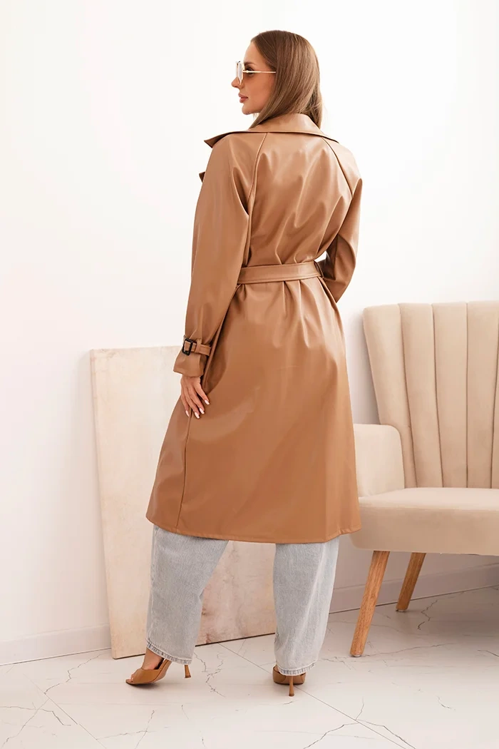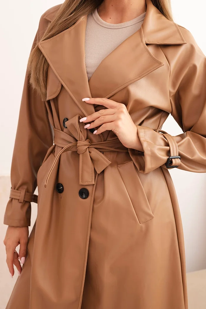 Trencz damski z ekoskóry z klasycznym kołnierzem i wiązanym paskiem camelowy Efektowny płaszcz damska o klasycznym fasonie trencza to idealny wybór dla kobiet ceniących nowoczesny styl i elegancję. Wykonany z gładkiego, lekko połyskującego materiału, model ten posiada szeroki kołnierz, podwójne zapięcie na guziki oraz pasek w talii, który pięknie podkreśla sylwetkę. Długość maxi dodaje mu szyku, a ozdobne klamry na rękawach nadają nowoczesnego charakteru.