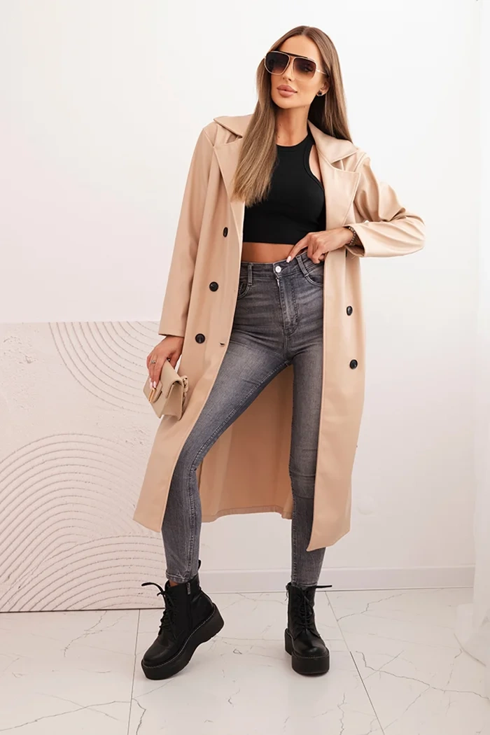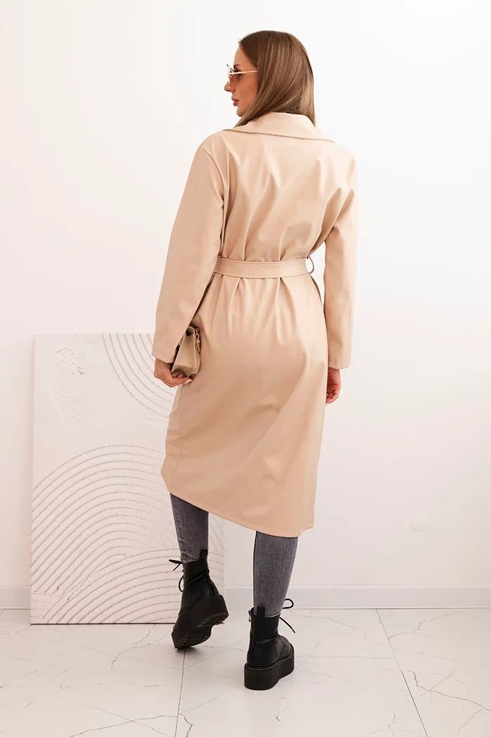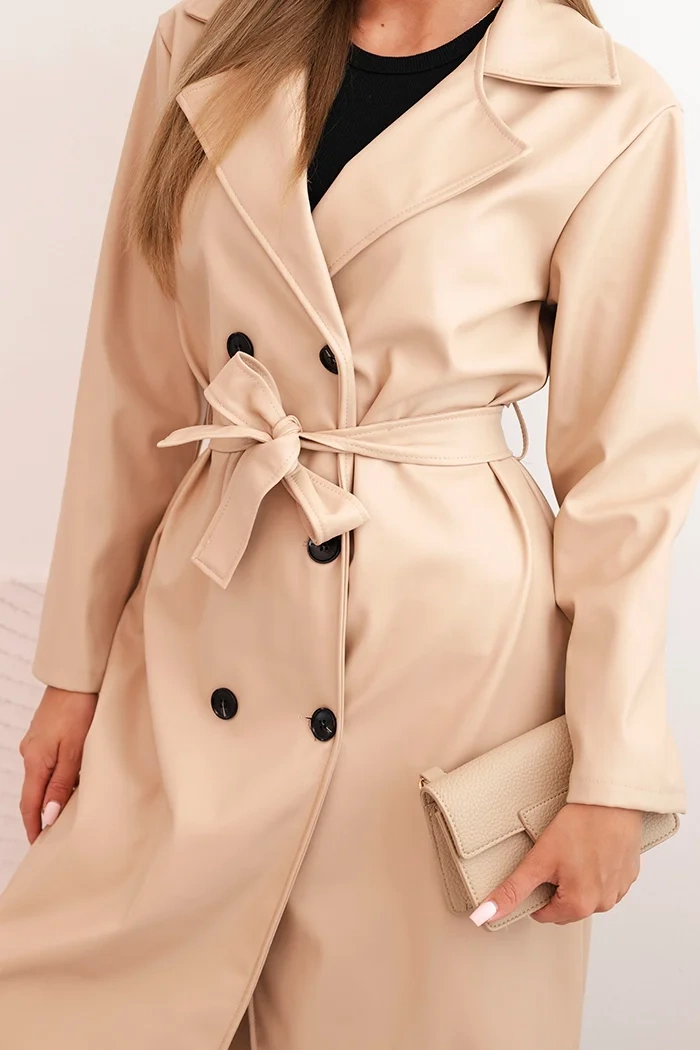 Trencz damski z ekoskóry z paskiem i kołnierzem beżowy Stylowy płaszcz damski w formie klasycznego trencza to idealna propozycja na sezon przejściowy dla kobiet ceniących elegancję i modny wygląd. Wykonany z gładkiego, lekko połyskującego materiału, płaszcz posiada dwurzędowe zapięcie na guziki, pasek wiązany w talii oraz szeroki kołnierz, który dodaje charakteru całej stylizacji.